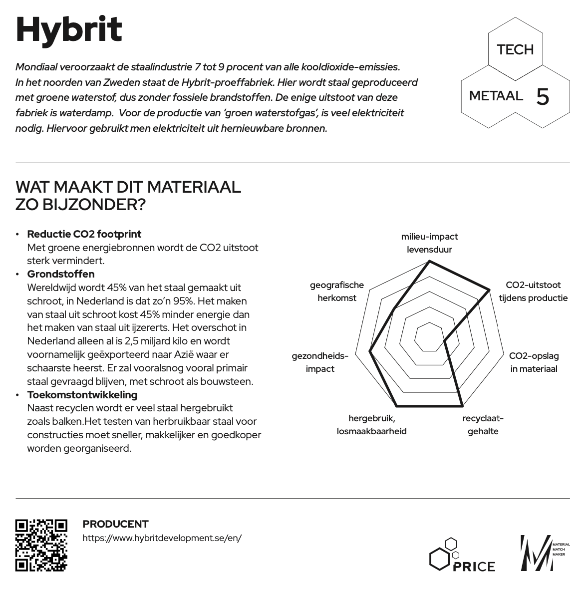LCA, EPD, MPG, MKI; belangrijke methodieken, maar het proces erachter zie je niet. Dus hebben we per materiaal de duurzaamheidsaspecten gewogen. Hoeveel percentage recyclede inhoud, hoeveel CO2 uitstoot bij de productie, hoe lokaal is het gemaakt, hoe schadelijk is het voor de gezondheid enzovoort. De resultaten zijn inzichtelijk gemaakt via het radardiagram, zo kun je goed de verschillen tussen materialen zien, en vooral; hoe het “scoort” op welke aspecten, en kun je zelf een afweging maken wat je belangrijk vindt.